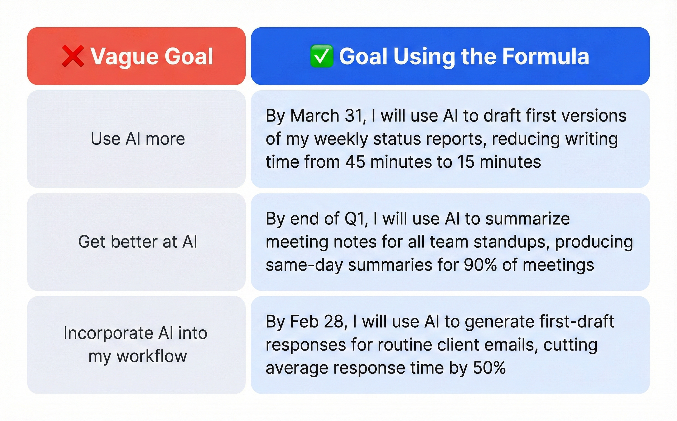 Bad: “Use AI in my workflow” Good: “Use AI to draft first versions of my weekly status reports”